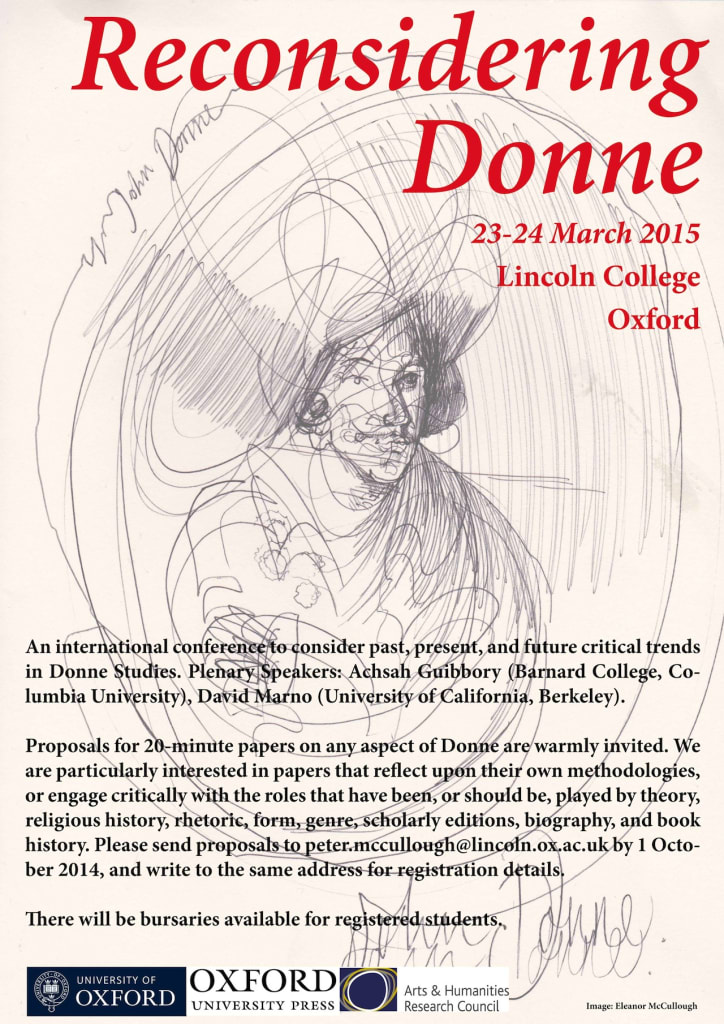 Proposals for 20-minute papers on any aspect of Donne are warmly invited. We are particularly interested in papers that reflect upon their own methodologies, or engage critically with the roles that have been, or should be, played by theory, religious history, rhetoric, form, genre, scholarly editions, biography, and book history. Please send proposals to peter.mccullough@lincoln.ox.ac.uk by 1 October 2014, and write to the same address for registration details.