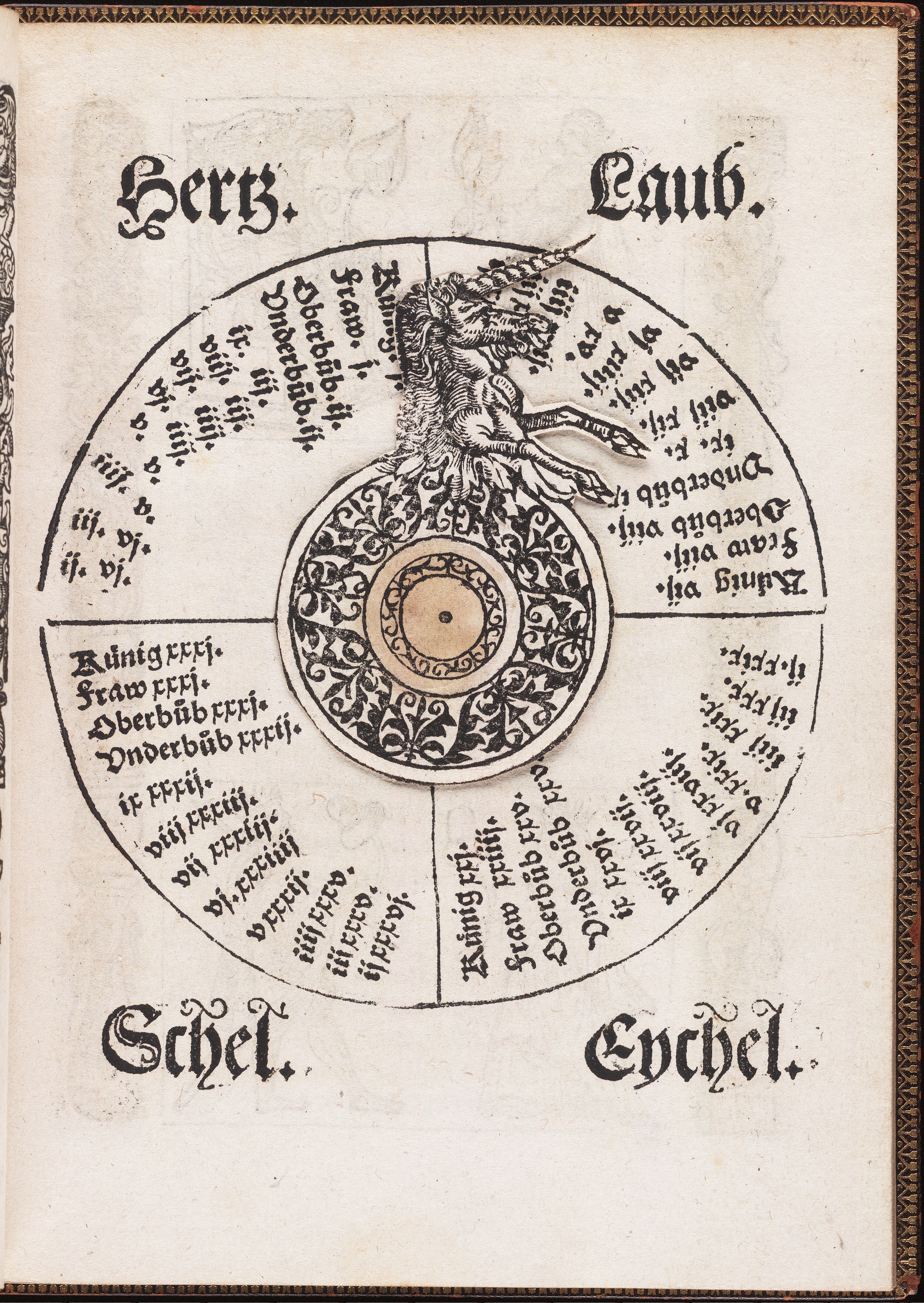 Figure six: Volvelle with unicorn, from Kartenlossbuch: Darinnen auss H. Schrifft vil Laster gestrafft, vnd heylsamer Leeren angezeygt werden (Strasbourg: Jacob Kammerlander, [1543]). Beinecke Library 1976 335. By permission of the Beinecke Rare Book and Manuscript Library, Yale University.