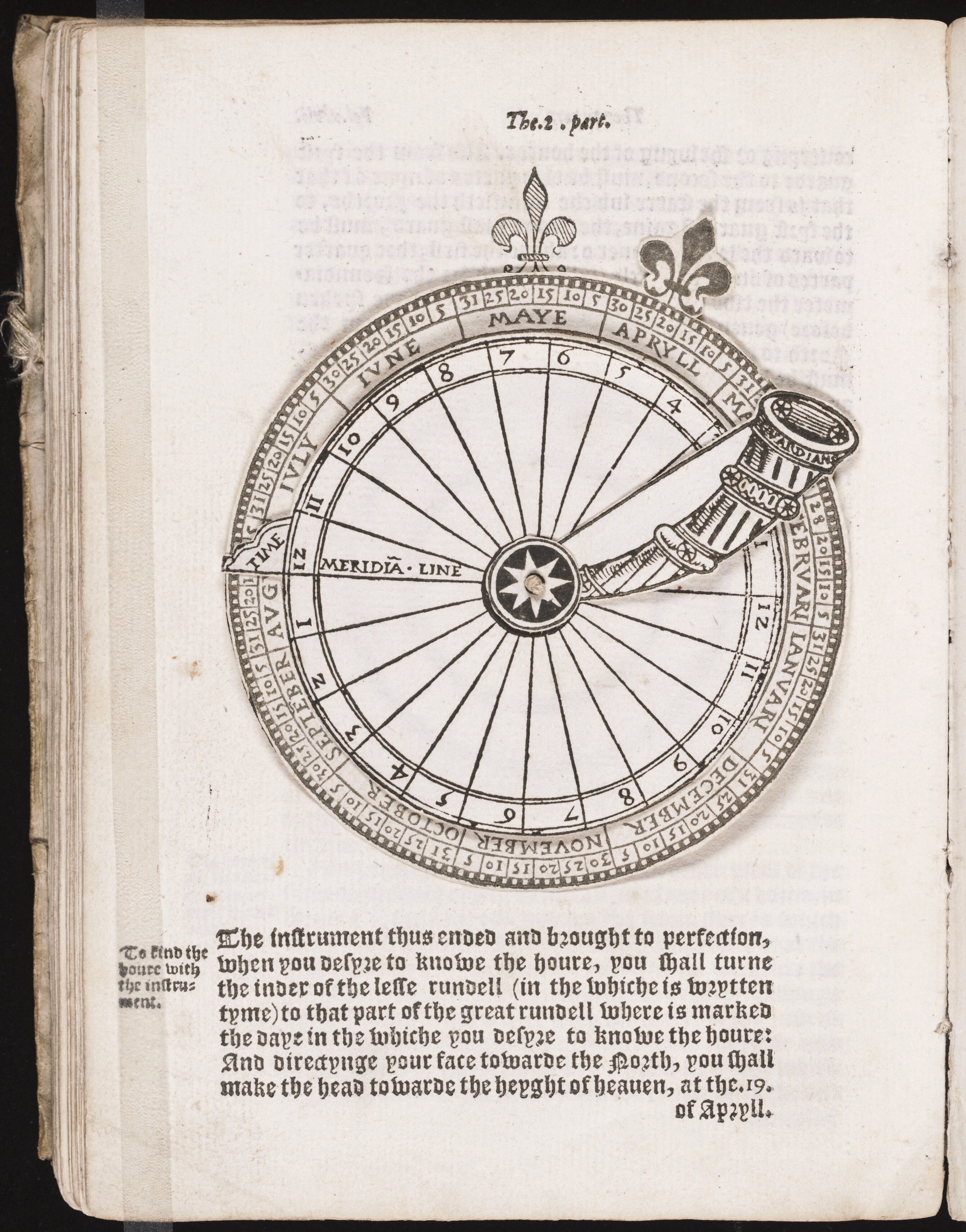 Figure seven: Volvelle, from Martin Cortes, The arte of nauigation, conteynyng a compendious description of the sphere, with the makyng of certen instruments and rules for nauigations ([London], 1561). Beinecke Library Taylor 129. By permission of the Beinecke Rare Book and Manuscript Library, Yale University.