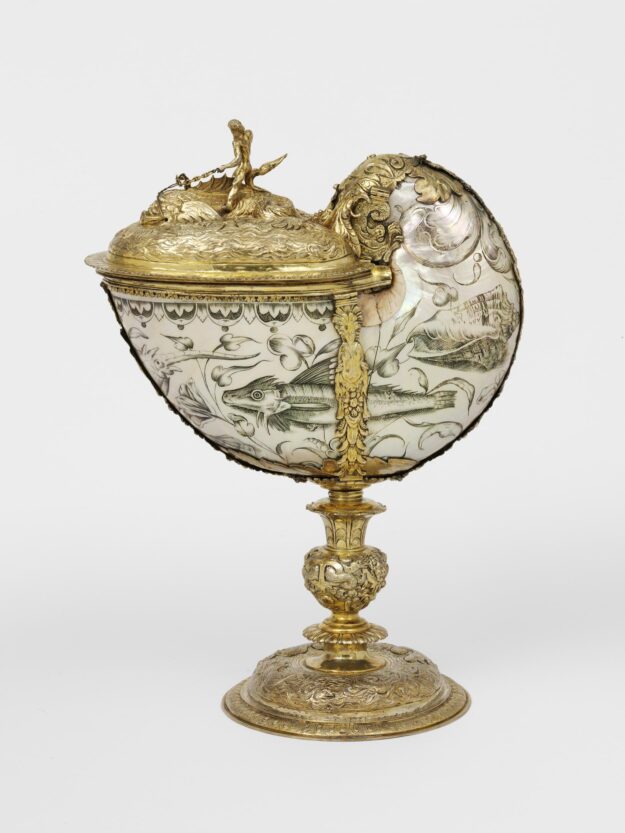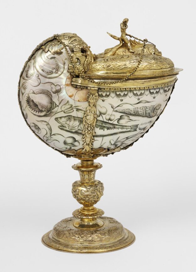 [25] The engraved eyes on the cup’s surfaces (on the monstrum marinum, on all the bird-like hinges, on the women of the strapwork, and on the fish) all gaze outward at the viewer. These are ornaments, on an ornament, to an ornament—which is then painted as an ornament. The fourth order of ornamentation is also neither ‘fake’ nor ‘real’ per se but something that purposefully calls into question this ontological binary in the Cabinet. This is uncertainty lavishly embodied: like the oyster, the nautilus cup is an object that does not invite easy answers, and indeed invites rather more questions. It is rooted, heavy to lift because it is silver-plated gold. It is also fragile because it is biological, and additionally because its status as a bearer of meanings is fluid. It is nature artificed beyond easy recognition, or artifice shaped to the natural so that it elides what naturalness can be. As many eyes look out at us from the Frewen Cup as there are ways we can look back at them. Oysters and pearls can’t look back at their viewers. The engraved and ornamented nautilus cup can in some sense, being endowed with faces and eyes, giving it an agency both in and of itself, and as it is represented in the collection still life.