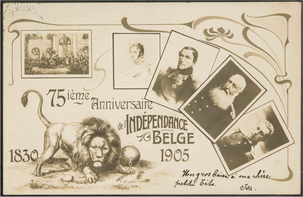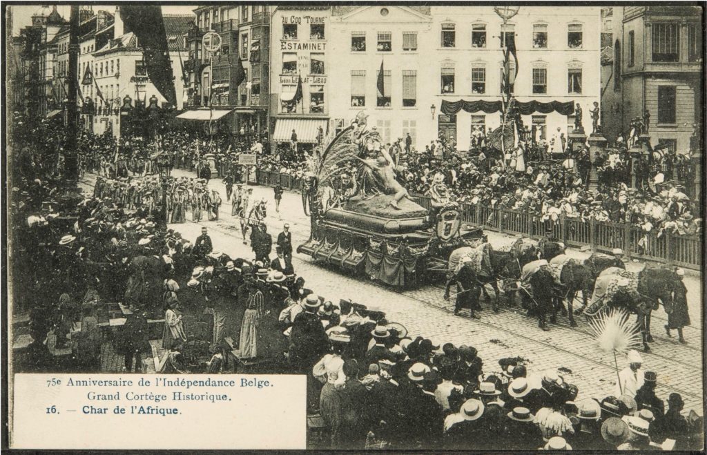 Except for special anniversaries once every twenty-five years, Belgian National Day was not lavishly celebrated during the reign of Leopold II of Saxe-Coburg and Gotha (1835-1909) (Beyen 2001: 74). In the summer of 1905, a triple Jubilee offered grounds for an exceptionally large national celebration of the sort (Programme général officiel des fêtes et cérémonies 1905). These revelries not only memorialised seventy-five years of national independence but also marked four decades of the king’s ‘power’ in his increasingly democratic homeland and two decades of his sole and private ownership of a colonised territory roughly seventy-six times Belgium’s size, the Congo Free State (1885-1908). As Leopold II’s ill-gotten gains were received as ‘a “gift” from the king to his (real) country’ [een ‘geschenk’ van de koning aan zijn (echte) land] (Verschaffel 2009: 68), he was addressed both as ‘King of the Belgians’ [Roi des Belges] and ‘Sovereign of the Congo Free State’ [Souverain de l’Etat Indépendant du Congo] during some ceremonial activities (Rouvez 1905: 96).