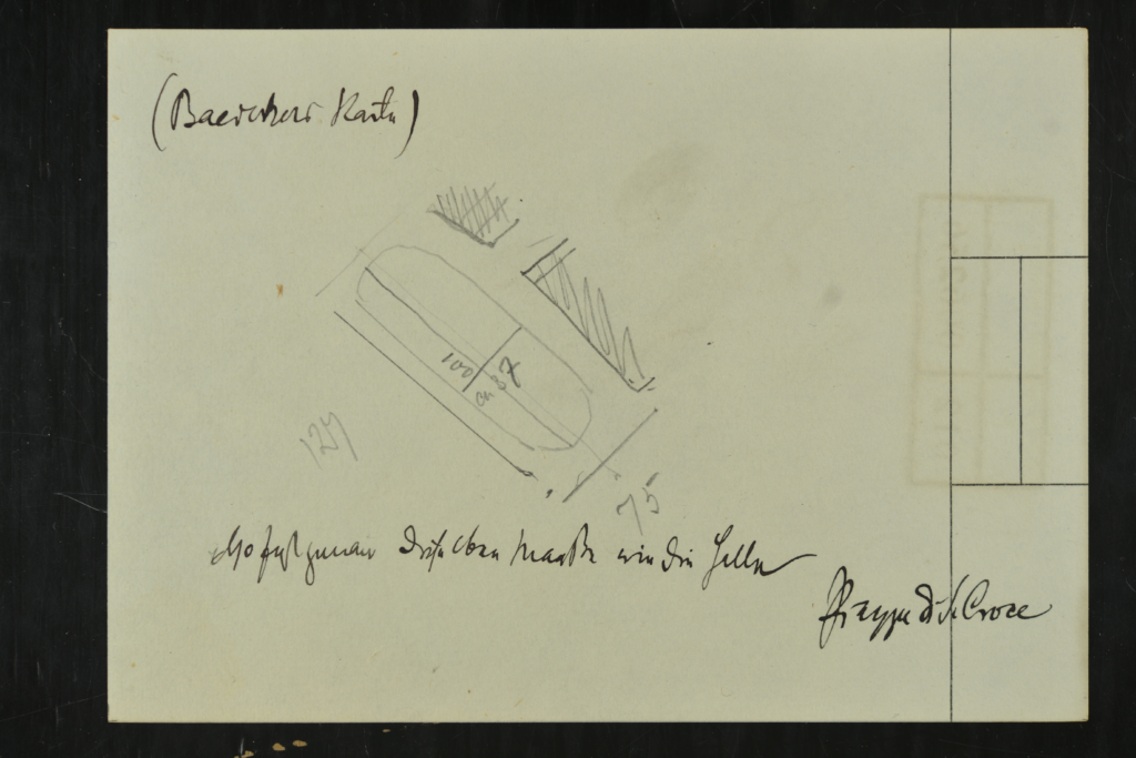 [4] Taking the reproductions with him to Brussels, Warburg received an exclusive invitation to the dress rehearsal and an entry ticket to the performance after presenting his research to one of the event’s organisers in his quarters at the Grand Hôtel Britannique (for his invitation and ticket, see Warburg Rare Books DCH 5150). He also came prepared for the final step in his case study of the Yale cassone, armed with a new affective strategy to join ‘the ranks of those who keep alive the “experience” of the past’ (Wind 1983: 26). In short, he put the set of reproductions to use in an on-site comparative experiment with a re-enactment of a contemporary jousting tournament. The only visual proof of this analysis are two sketches of the Piazza Santa Croce’s floor plan (fig. 3, copied from a Baedeker Guide) containing the Hall du Cinquantenaire’s measurements (ZK 12: 012/006256; Warburg Rare Books DCH 5150).