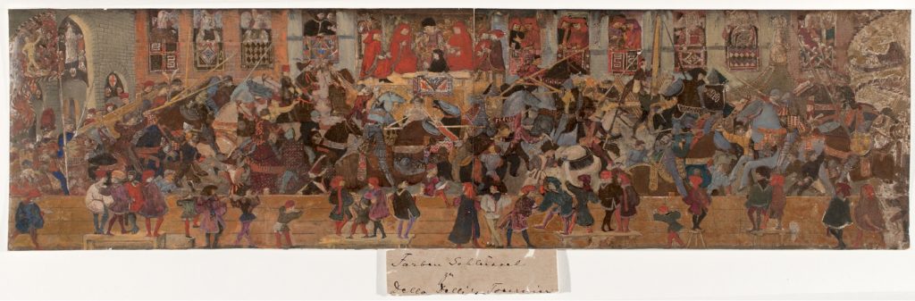 Indeed, he saw the historical tournament as holding potential to enrich several aspects of his research endeavours on festivals in Flanders and Florence, and by contrast and comparison, vivify one specific object of his study (Wedepohl 2014: 155). This (fig. 2) is a fragment of a Florentine cassone (or a wedding chest) depicting a jousting tournament at Piazza Santa Croce, not accurately accounted for at the time, but now attributed to Apollonio di Giovanni (1414-65) or his workshop and kept at Yale University Art Gallery, New Haven, since 1871 (Stechow 1944; Gombrich 1955; Callmann 1974: no. 21).[1]
